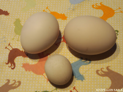 Meillä pikkukanatkin ovat alkaneet munimaan. Ensimmäiset pikkuruiset munat ovat aika hellyttäviä!
